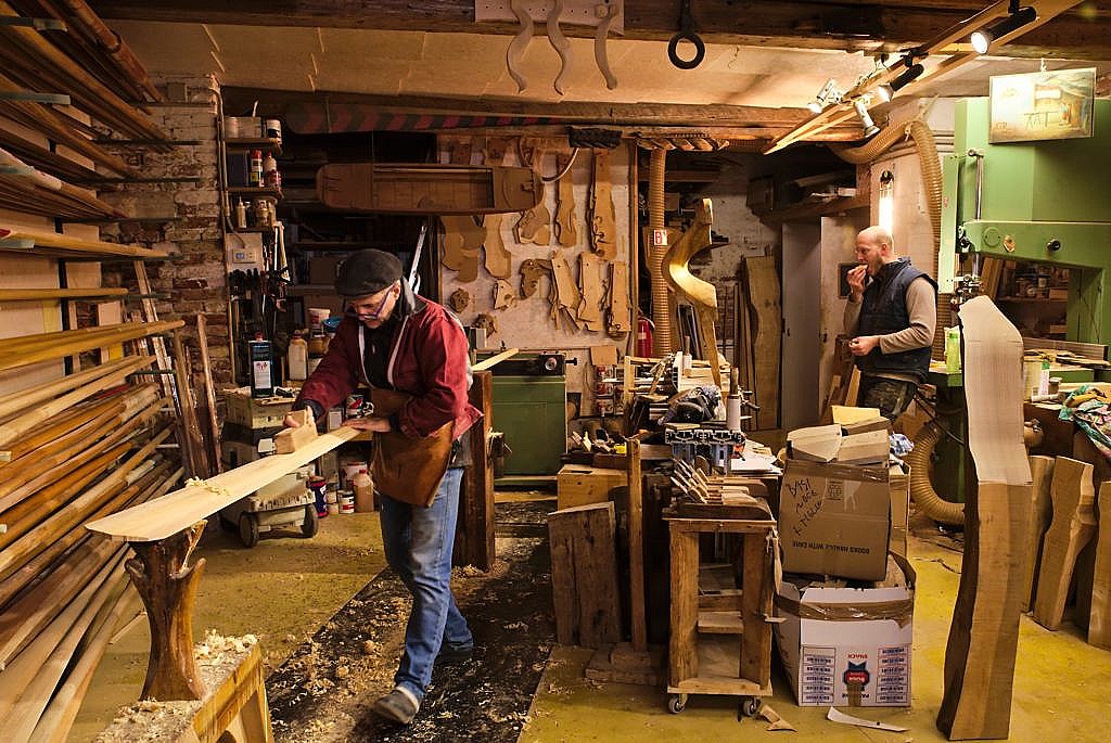 Oarmaker Saverio Pastor chatting with a guest in his workshop, while leaning on a forcola